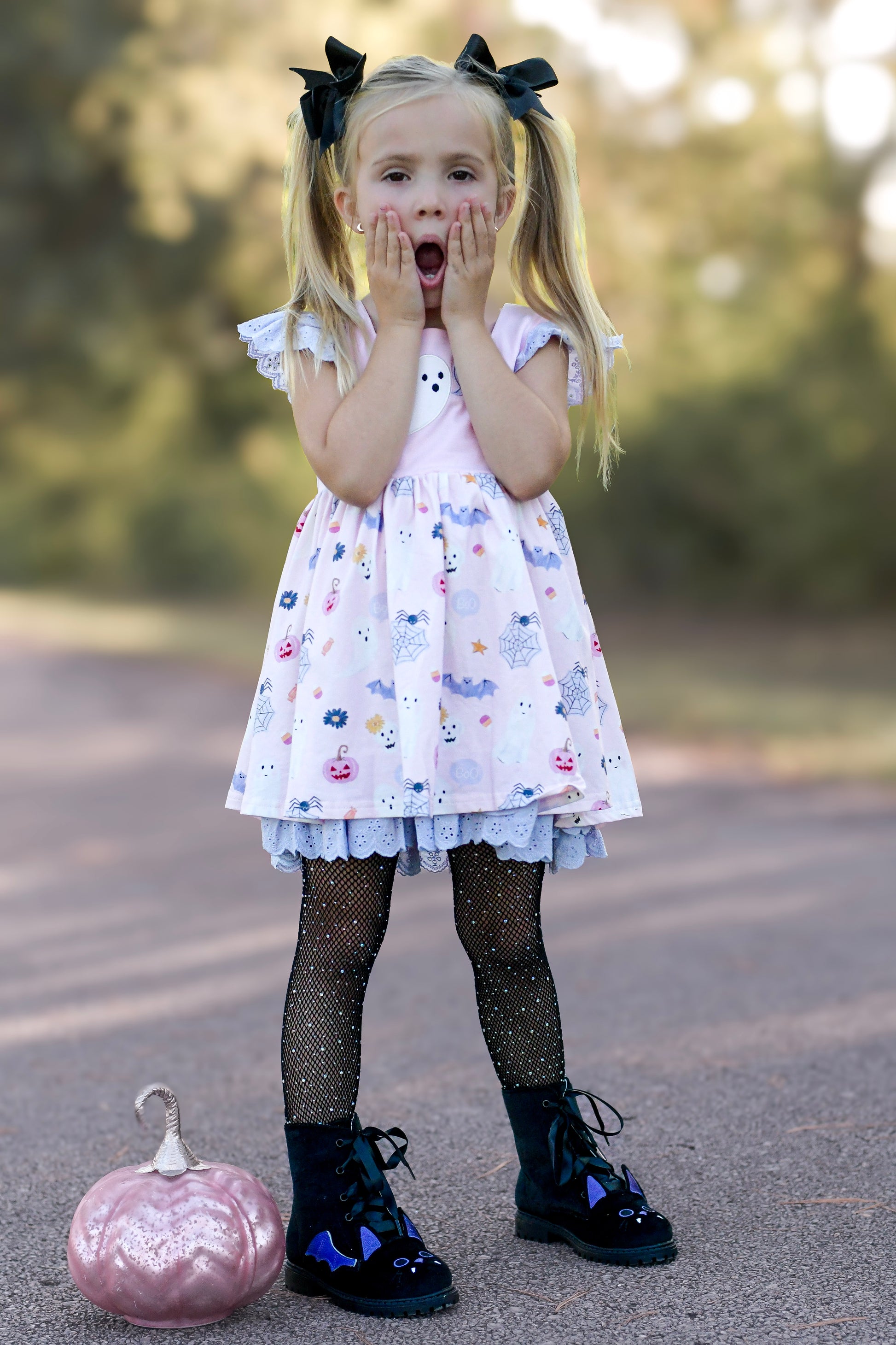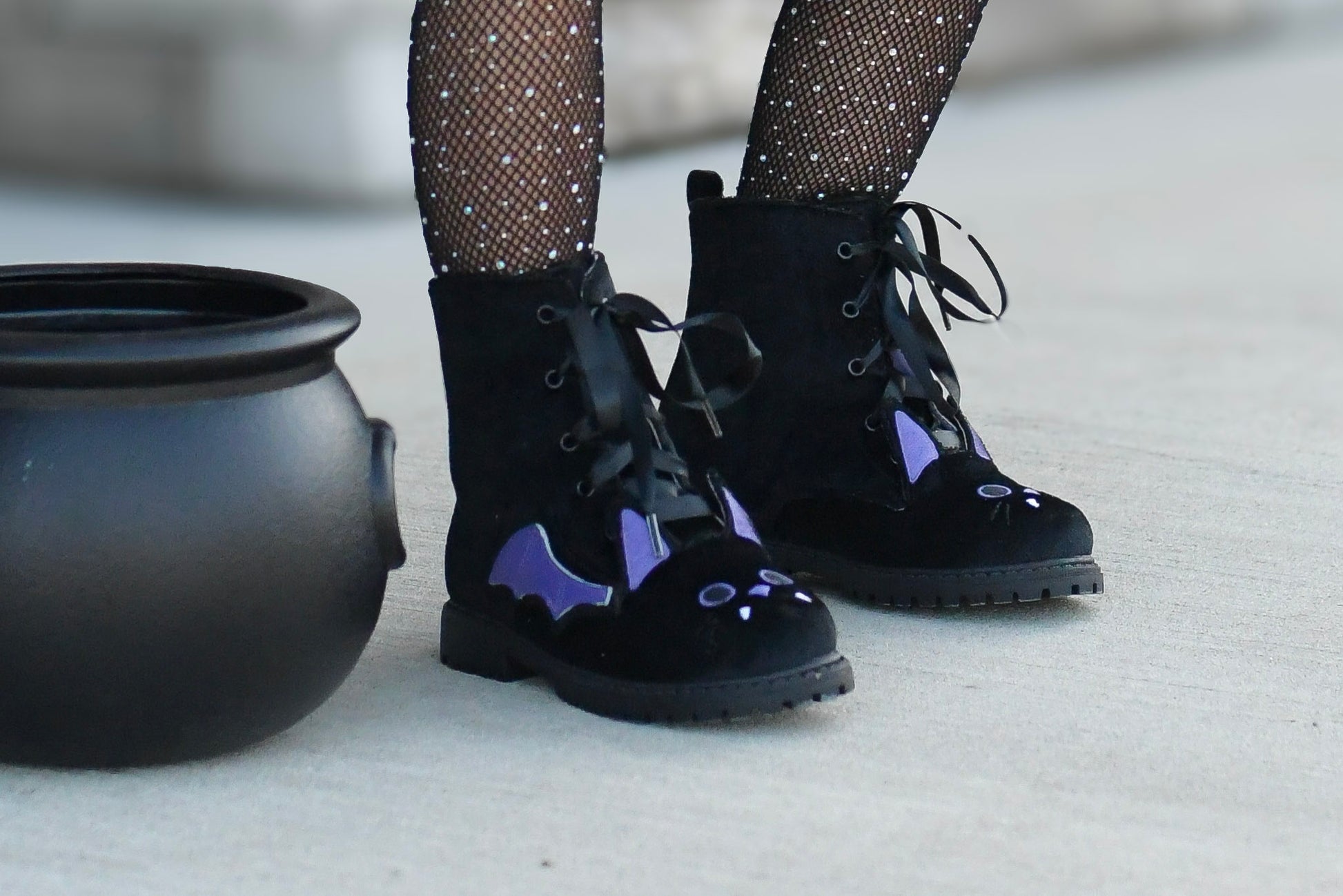 Creep it cute in our Batty Boots — where spooky meets sweet! These black velvet boots feature a mischievous embroidered bat face with fangs and bright purple ears on the toe, while the sides sprout whimsical purple bat wings for a fang-tastic finishing touch (one wing per shoe. With sturdy soles and satin ribbon laces, they’re built for both haunting adventures and everyday fun. The lilac lining adds an extra pop of color that’s perfect for Halloween season—or any time your little ghoul wants to channel their inner spooky kitty.