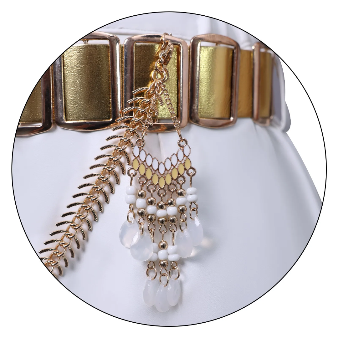 Statement Accessories – Golden floral emblems with tasseled drops, chains, and metallic waist belts bring luxe sophistication.