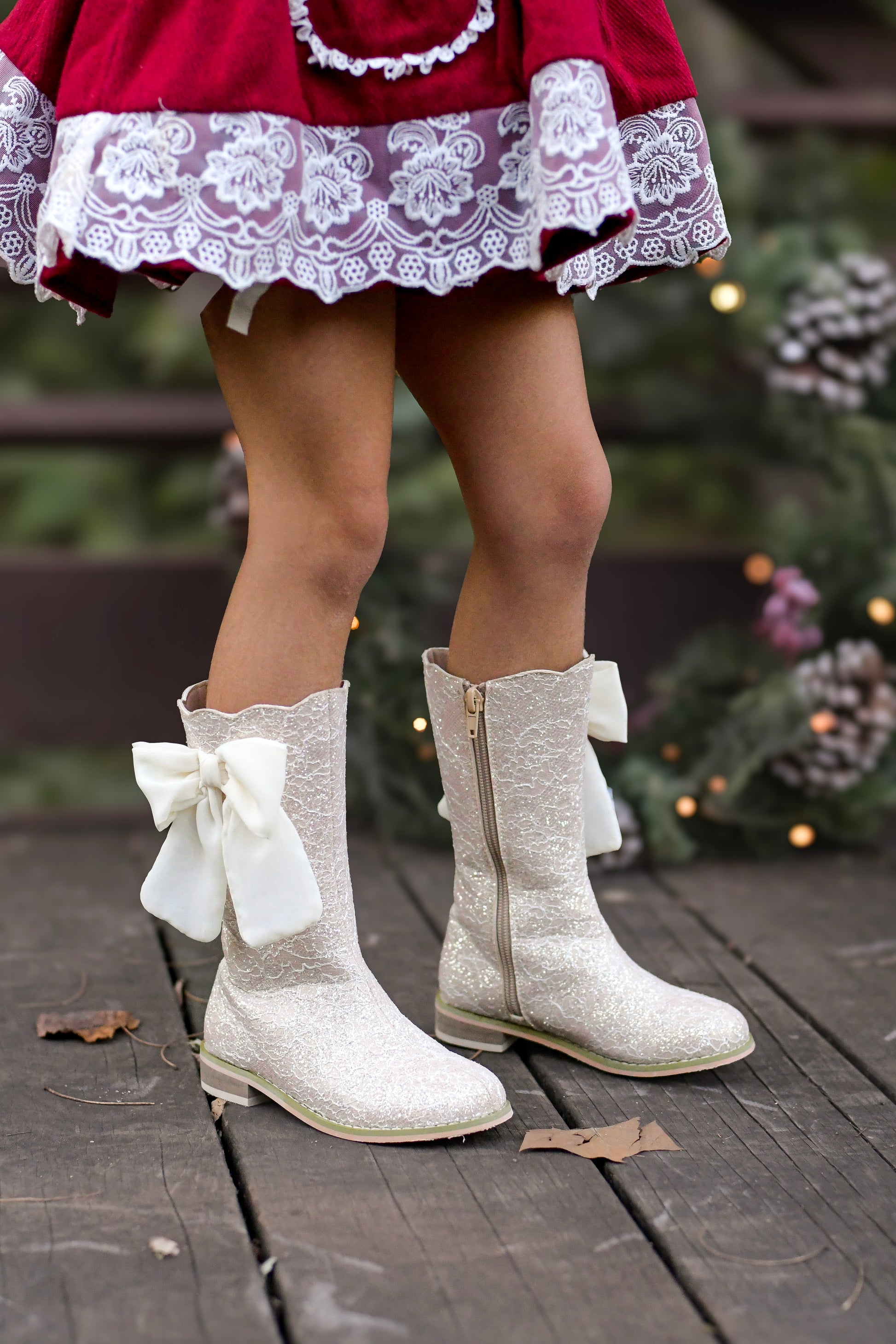 Make every step feel magical with the Sugarplum Bow lace Boots. These dreamy boots shimmer with an all-over glitter lace overlay and feature a sweet scalloped edge for a touch of fairytale charm. The statement bow on the back adds the perfect finishing touch—soft, elegant, and absolutely eye-catching.